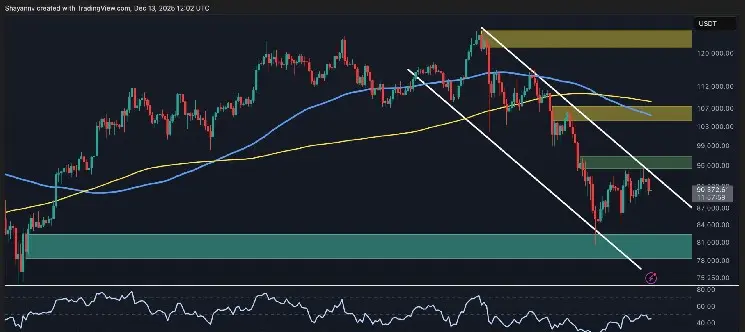 買い手は$95K を超えるクリーンなブレイクアウトとともに出来高を伴う動きを望み、$100K ゾーンをターゲットにします。一方、売り手は上昇トレンドラインを下回るブレイクを狙い、$85K や重要な$80K エリアの再テストを目指します。