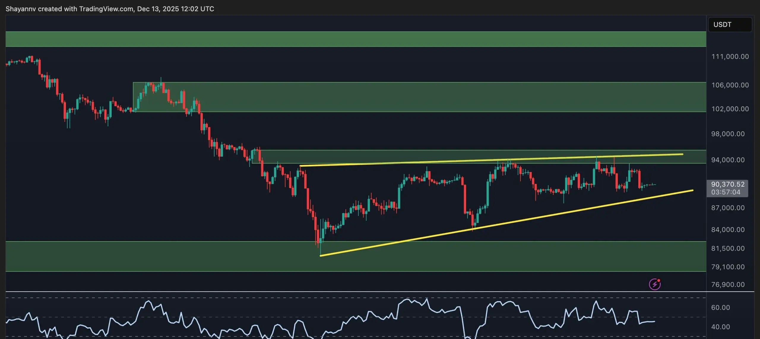 4Hチャートにズームインすると、BTCは$80K と$95Kの間で明確な上昇三角形を形成しています。この種の構造はしばしば上方向に解決しますが、出来高とモメンタムがブレイクアウトをサポートしている場合に限ります。現在、$94K 付近のブレイクアウト試行は何度も拒否されています。