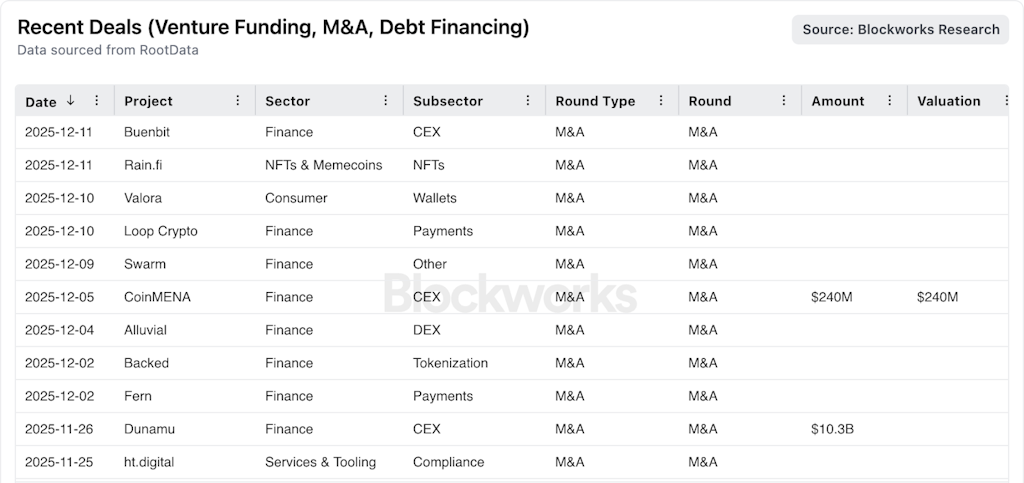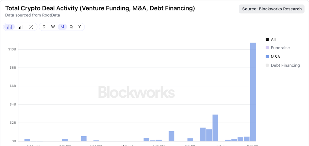 暗号業界のM&A活動は劇的に拡大している。2025年11月のM&A取引額は約107億ドルに達し、主に取引所分野での大規模買収によるものだ。2025年第3四半期には暗号のM&Aが初めて$10 十億ドルを超え、過去の記録$5 十億ドルを倍増させ、2024年の同時期と比べて30倍の跳躍を示した。