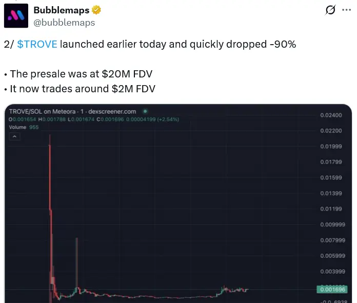 新たにローンチされたTROVEトークンは、ローンチからわずか10分で95%以上下落し、価格は$0.0008にまで下落、時価総額は$20 百万から$1 百万未満に減少したとDEXScreenerのデータが示している。