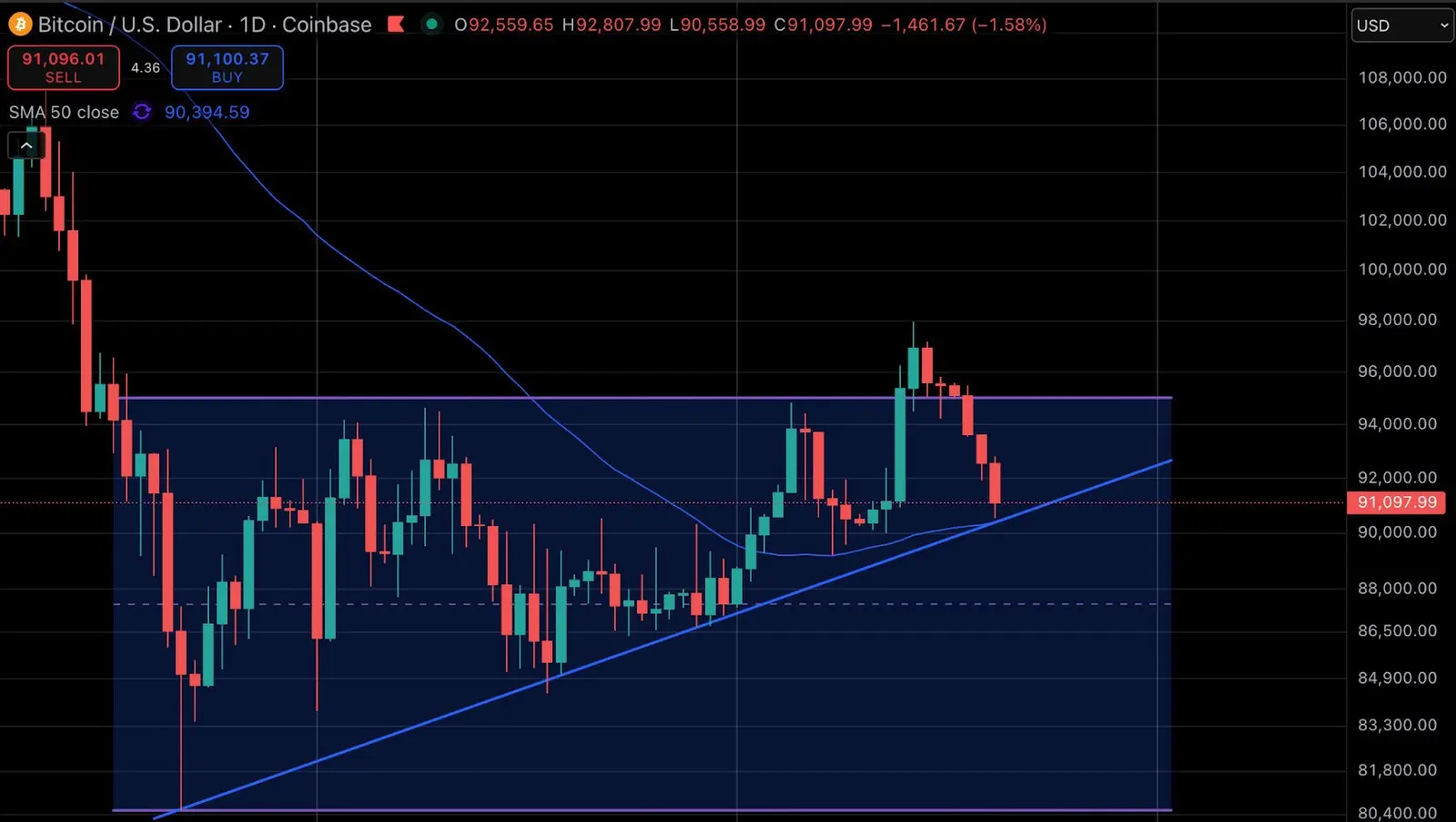 BTCが保持すべき最初の重要レベルは、50日単純移動平均線(SMA)です。これは現在$90,400に位置し、昨年11月に記録された$80.5Kの安値から遡る上昇トレンドラインと一致しています。