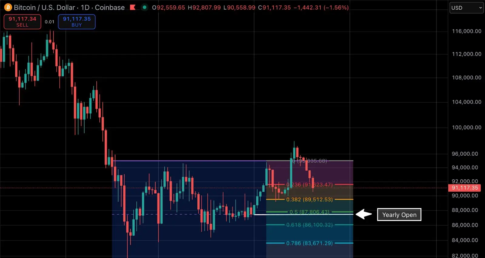 50日SMAを超えた後、注目は年初の$87.5K付近に移り、これは0.5フィボナッチリトレースメントと一致します。そのすぐ下には、フィボナッチのゴールデンポケット(~$86K)があり、これはより広範な統合構造を維持するために保持すべき重要なゾーンです。