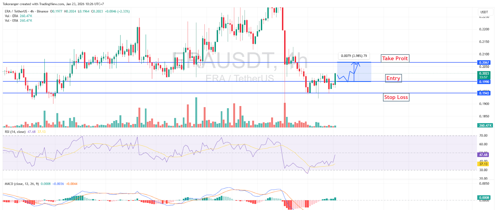 ERA/USDT (4時間足)は、現在下降トレンドにあるが、短期的な反発の兆しも見え始めている。陽線のローソク足が進行中で、RSIはゴールデンクロスを形成し、50付近に上昇中。上昇の可能性は開かれているが、完全には確定していない。