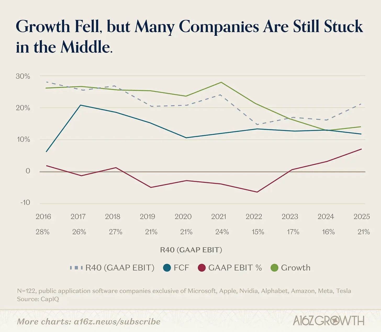 はい、フリーキャッシュフローは改善し、GAAP利益率も向上しています。しかし、株式報酬を実際の支出とみなすと、多くの企業は依然として厳しい中間地帯にいます。成長が遅すぎて高成長の評価プレミアムに値しない。株式希薄化が進みすぎて安定した評価倍率に値しない。