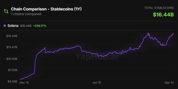 Solana のオンチェーン経済は拡大を続けており、ネットワーク上のステーブルコイン供給は新たな史上最高値の $16.44 billion に急増しました。これは前年比で 256% 超の大幅な上昇を示す、劇的な伸びです。