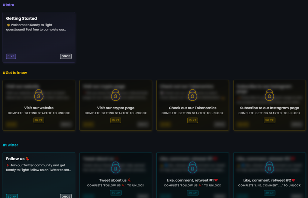 RTFコミュニティアドベンチャーへの着手はシームレスな体験であり、Ready To FightアプリケーションとZealy内の一連のタスクをガイドして、RTFトークンを簡単に収集します。目標達成まであと2歩です。これらの明確で連続したガイドラインは、RTFトークンのあなたの部分を確保するためのさまざまな活動を通してあなたを導きます!