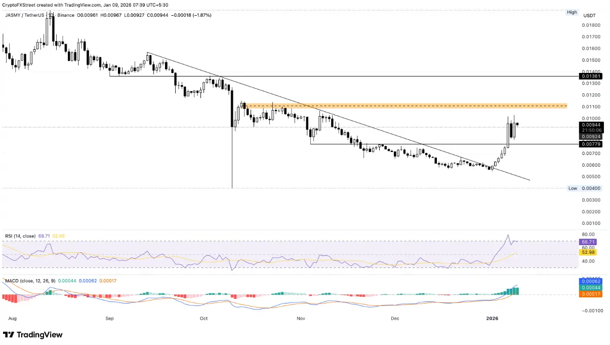In a positive scenario, if JASMY successfully breaks through the 0.01000 USD mark, the price could extend its rally toward the supply zone around 0.01100 USD, a level last tested on October 29.