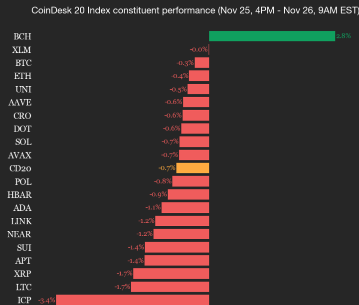 CoinDesk 20 パフォーマンスアップデート: ビットコインキャッシュ (BCH) のみが上昇、2.8% 増加