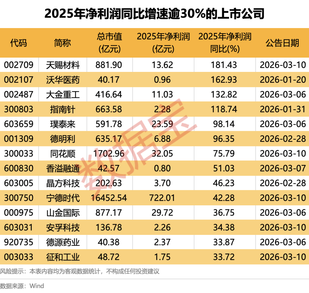 Looking at net profit changes, a total of 14 companies saw their 2025 full-year net profits increase by over 30% year-on-year. Tinci Materials, Wuhua Medicine, Dajin Heavy Industry, and Zhinan Zheng have doubled their net profits, with Tinci Materials showing the highest increase at 181.43%.