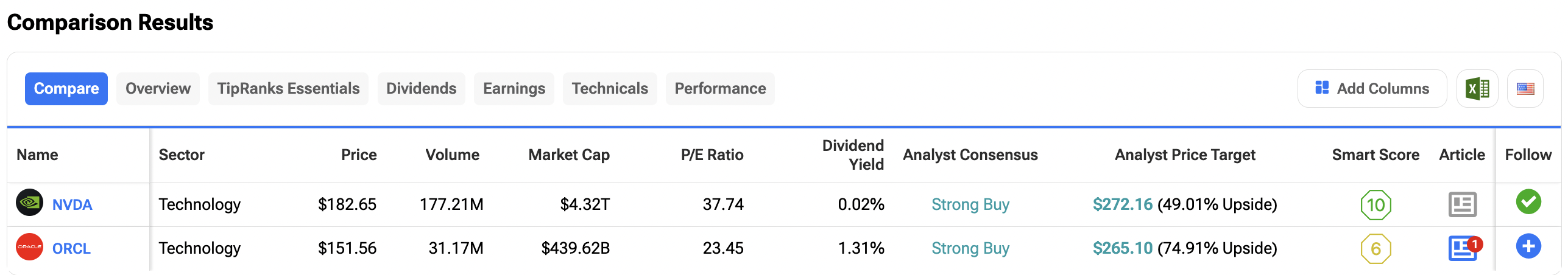 We utilized TipRanks’ Stock Comparison tool to compare Oracle and Nvidia side-by-side. Analysts view both stocks as a Strong Buy. However, Oracle has more upside potential from its average price target. This could be because much of Nvidia’s success may have already been priced in.