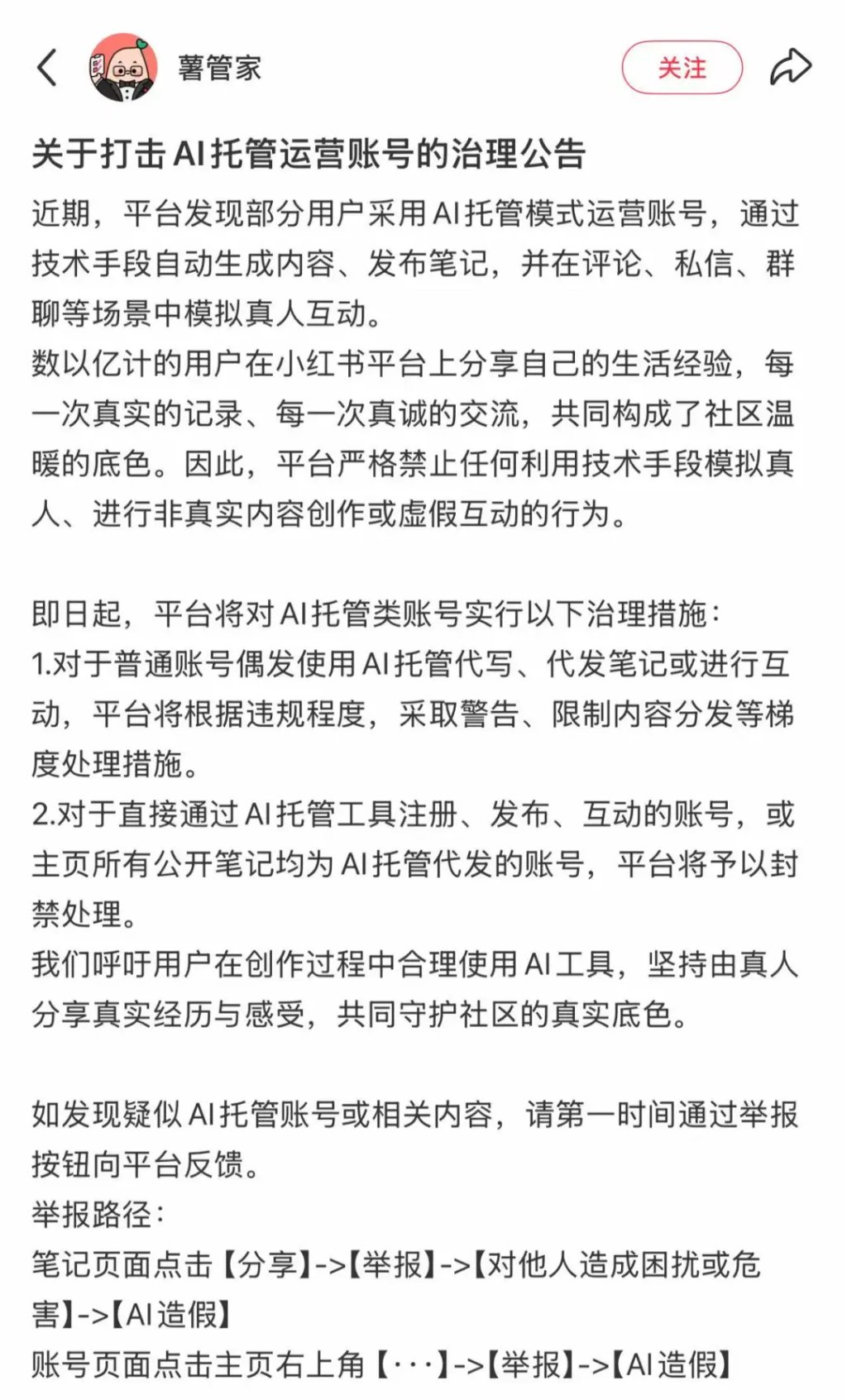 2. For accounts that directly register, post, or interact using AI management tools, or whose homepage’s public notes are all AI-managed posts, the platform will ban these accounts.