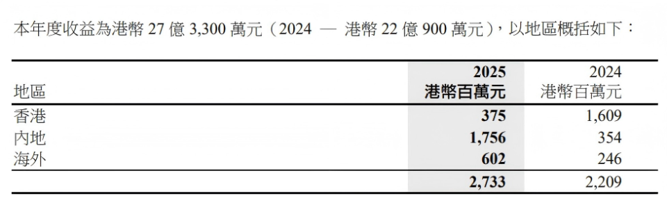 Breaking down the HKD 2.733 billion in property sales revenue, Mainland China contributed HKD 1.756 billion, nearly quadrupling year-on-year; Hong Kong only contributed HKD 375 million, a 76.69% decline.