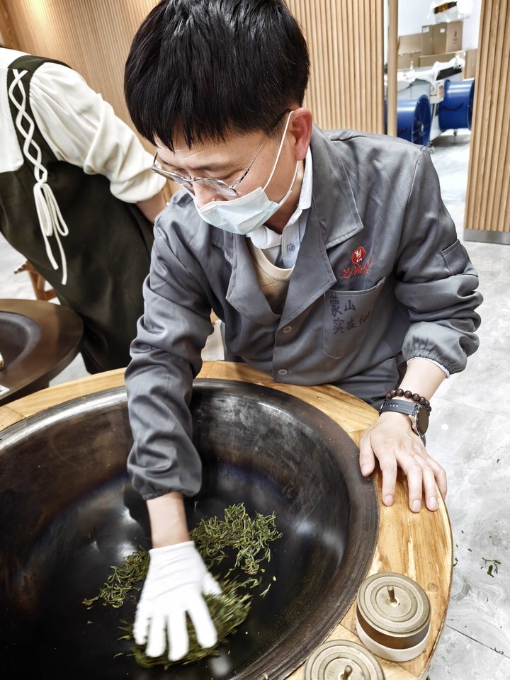 An associate technician, Xu Xiaoshun, demonstrates the tea pan-frying process to visitors.