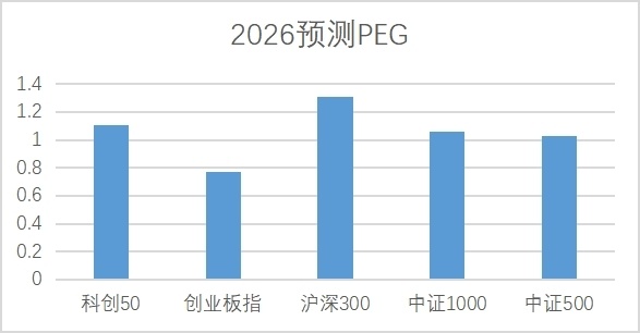 Chart: The forecasted 2026 PEG for the Sci-Tech Innovation 50 is not high compared with other broad indices
