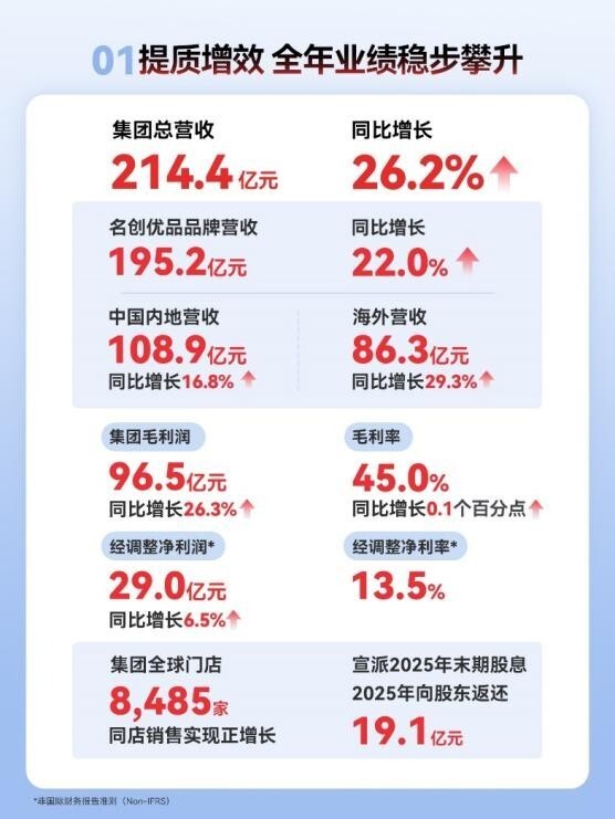 From the fundamentals of performance, the group’s total annual revenue reached 21.44 billion yuan, a year-on-year increase of 26.2%, showing an accelerating trend quarter by quarter—the fourth quarter revenue was 6.25 billion yuan, with a year-on-year growth rate rising to 32.7%, surpassing the 6 billion milestone. Profitability remains resilient, with gross profit of 9.65 billion yuan, up 26.3% year-on-year, gross margin stable at 45.0%; adjusted net profit of 2.90 billion yuan, up 6.5% year-on-year, maintaining core business profitability in a complex environment. The performance of segmented brands is equally impressive: core brand MINISO revenue of 19.52 billion yuan, up 22.0% year-on-year; trendy toy brand TOP TOY revenue of 1.92 billion yuan, a significant increase of 94.8%, highlighting the synergy of a diversified matrix.