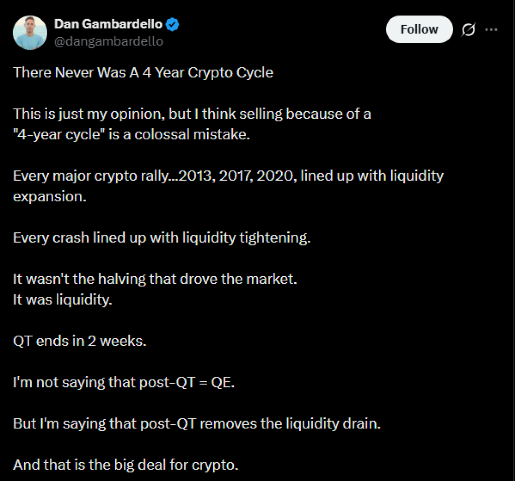 Especialistas como Dan Gambardello afirmam que nunca houve um ciclo de 4 anos no mercado de criptomoedas, que era o que a maioria esperava este ano. Ele diz que pensar que o mercado de criptomoedas se move em um ciclo de 4 anos é um erro colossal, pois cada grande rally de criptomoedas sempre coincidiu com uma expansão de liquidez, não com um ciclo.