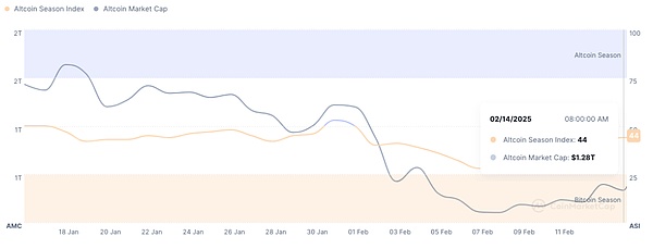 Índice de chegada da temporada de imitação: Até 14 de fevereiro, o índice atual de chegada da temporada de imitação é 44, o que significa que o efeito da riqueza está se concentrando no BTC.