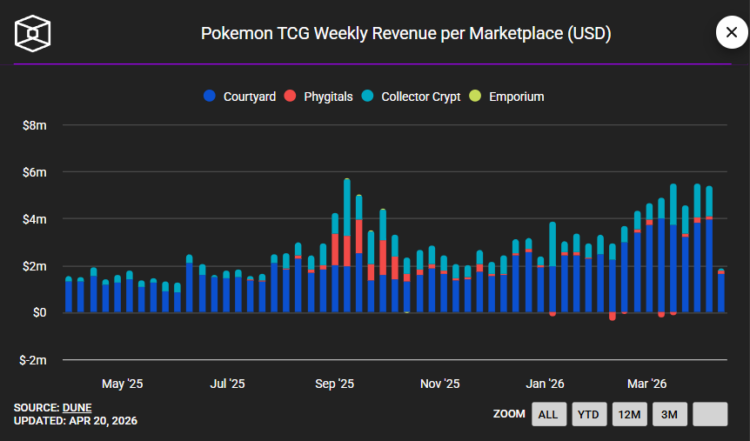 Na celebração do 30º aniversário de Pokémon, o mercado de NFTs de cartas de Pokémon, também chamadas de “tokenização” de cartas de Pokémon, está em alta, com ganhos de 5,38 milhões de dólares na semana até 6 de abril, aproximando-se do recorde histórico de setembro de 2025.