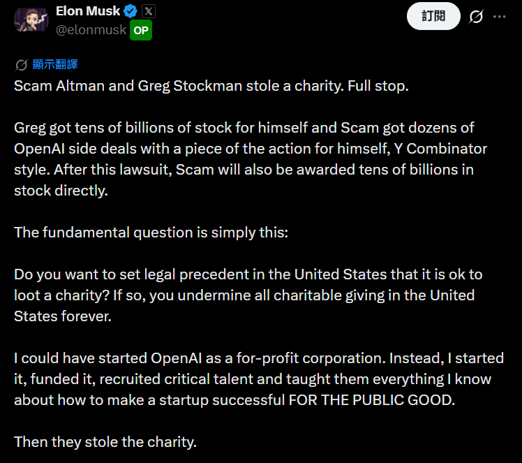 Musk foi o primeiro a postar no X criticando Altman e Brockman, chamando-os de trapaceiros, Scam Altman e Greg Stockman, acusando-os de roubar de uma organização beneficente, alegando que Brockman teria obtido ações valendo centenas de bilhões de dólares para si, enquanto Altman teria organizado dezenas de negócios com benefícios adicionais.