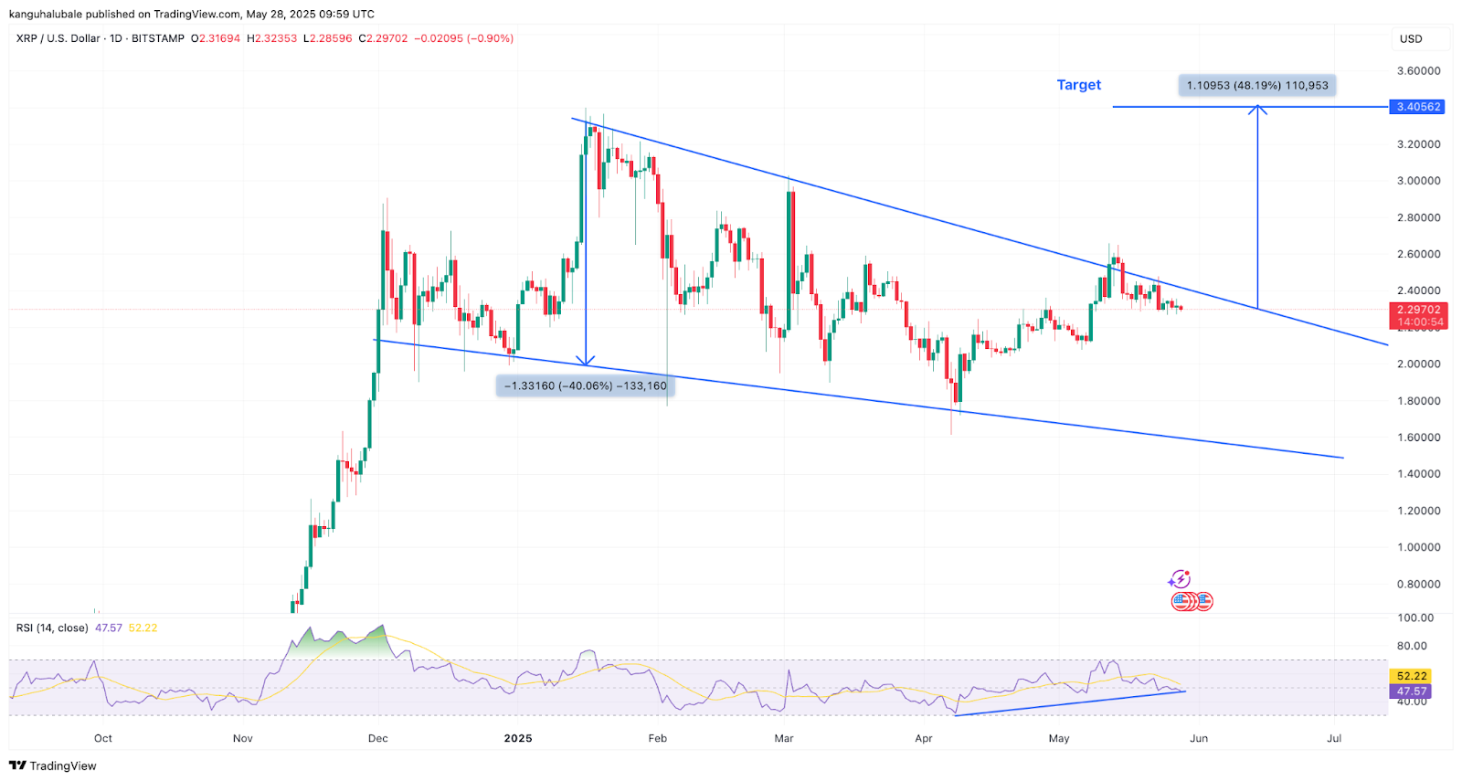 “XRP não apresenta uma tendência clara e continua a manter o padrão falling wedge. Se romper este padrão, o mercado irá em direção à resistência de 2,8 dólares. Se ultrapassar esta faixa, iremos em breve avançar para um novo máximo histórico”, escreveu o trader em uma postagem no X em 28/5.