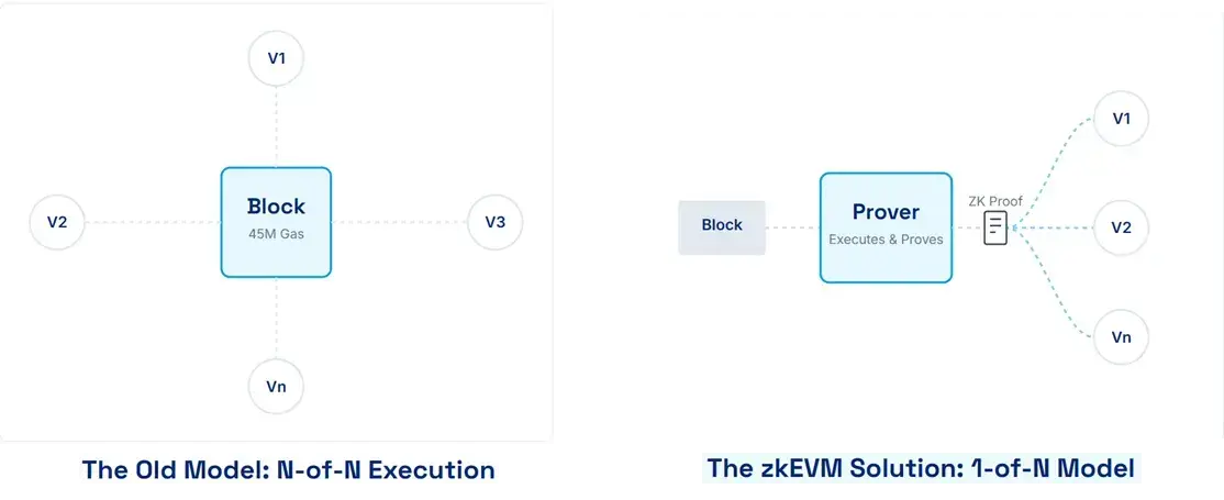 1 de N Novo Paradigma: um pequeno número de provers executa um bloco inteiro e produz provas curtas; toda a rede faz apenas validação em tempo constante. O custo de validação é muito inferior ao da reexecução, permitindo aumentar com segurança o limite de gás L1 e reduzir os requisitos de hardware.