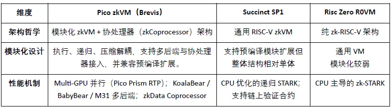 Comparado à arquitetura RISC-V zkVM de relativa monolítica Succinct SP1 e ao modelo de execução RISC-V genérico do RISC Zero R0VM, o Pico realiza a desacoplagem e expansão das fases de execução, recursão e compressão através do Modular zkVM + Sistema de Coprocessador, suportando a mudança entre múltiplos backends e a integração de coprocessadores, formando uma vantagem diferenciada em desempenho e escalabilidade.
