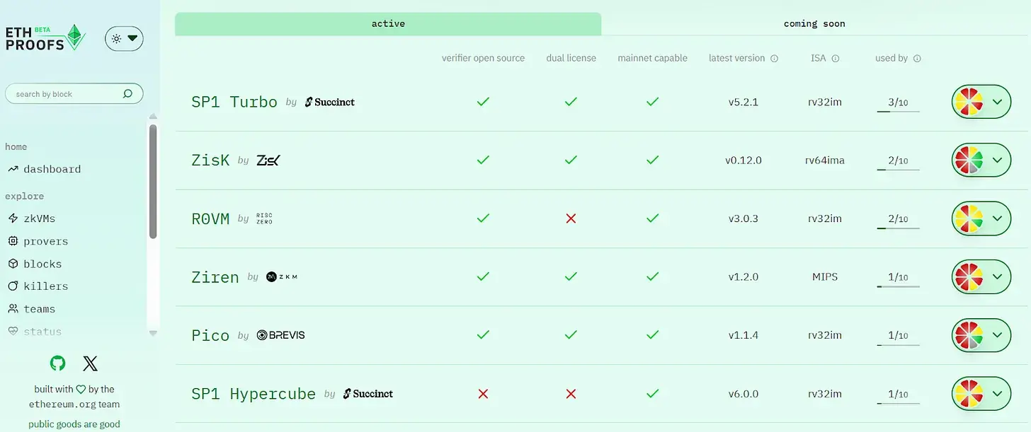 Atualmente, o ETHProofs.org, apoiado pela Fundação Ethereum, tornou-se a plataforma central de rastreamento da rota L1 zkEVM de Provas em Tempo Real (Realtime Proving, RTP), para exibir publicamente o desempenho, a segurança e o progresso da adaptação à mainnet de cada zkVM.