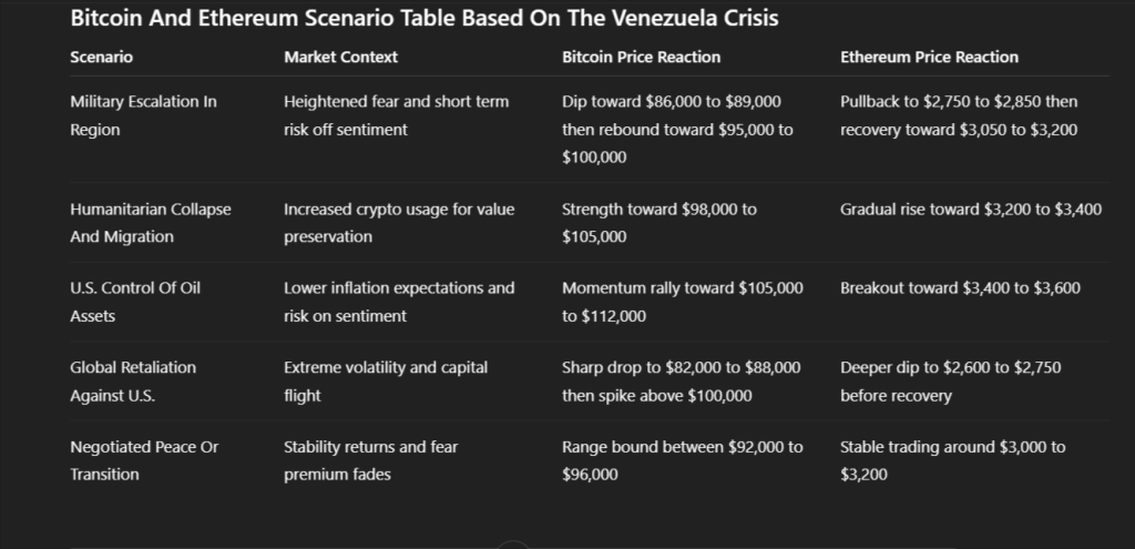 Se as forças dos EUA permanecerem profundamente envolvidas e países vizinhos como Colômbia ou Brasil aumentarem a prontidão militar, os mercados globais poderiam entrar em uma fase de aversão ao risco de curto prazo. O preço do Bitcoin poderia cair para a faixa de $86.000 a $89.000 à medida que a liquidez se estreita durante o choque inicial.