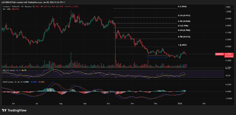 • Indicadores técnicos como o MACD e o RSI mostram que a pressão de venda está a diminuir, enquanto os compradores defendem a importante zona de suporte de $0.40.