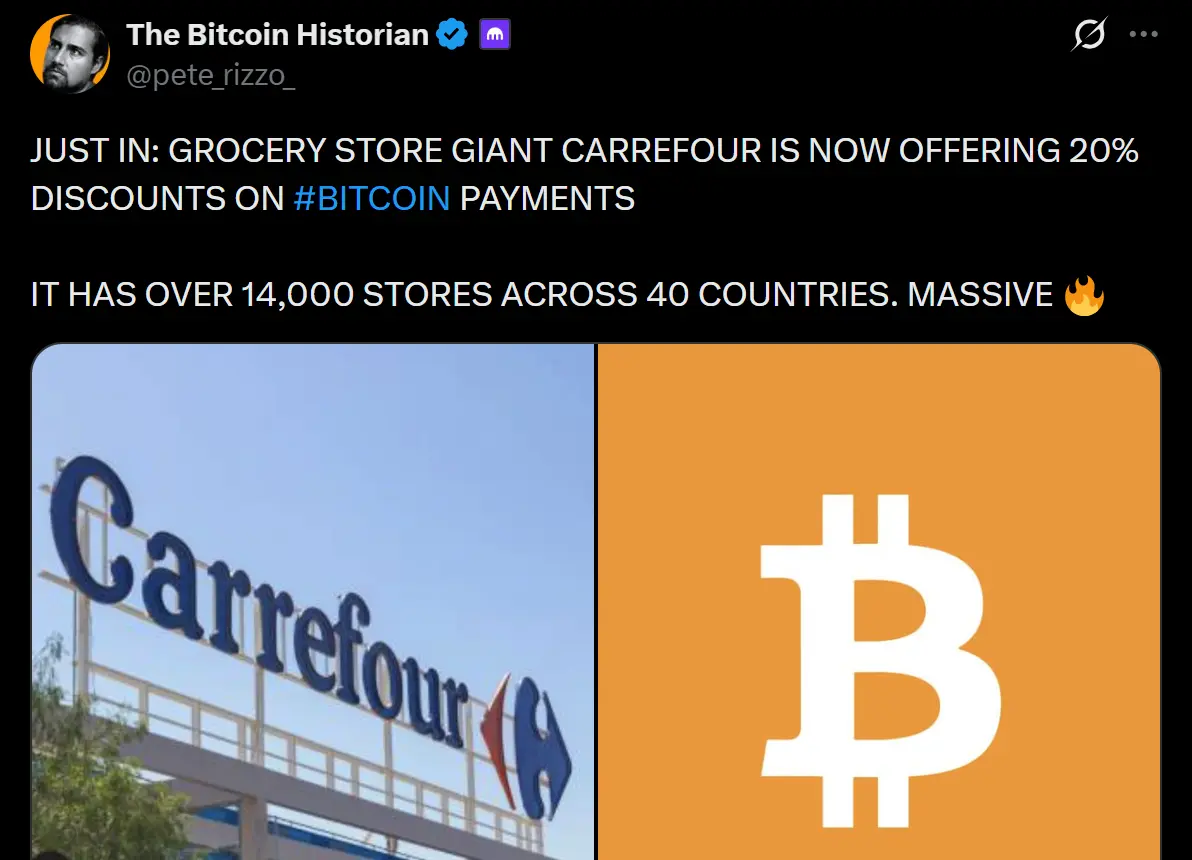 Uma franquia francesa Carrefour Express começou a oferecer descontos de 20% aos clientes que pagarem as suas compras com Bitcoin, de acordo com publicações nas redes sociais e reportagens locais. Esta iniciativa tem atraído atenção mundial, dado que o Carrefour está entre os maiores grupos de supermercados do mundo, operando mais de 14.000 lojas em mais de 40 países.