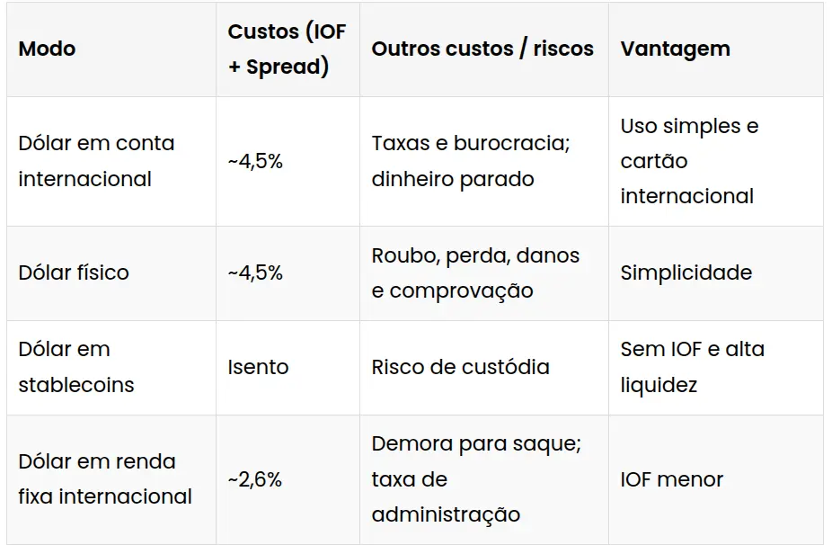Além disso, a compra de dólares físicos em casas de câmbio envolve o custo de 3,5% de IOF sobre cada operação de compra e o custo do spread cambial.