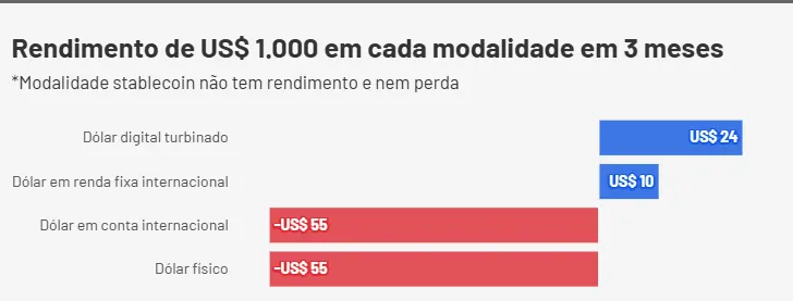 O resgate pode ser feito de forma imediata e o ganho proporcional estimado em três meses é de aproximadamente 2,41% sobre o valor mantido em dólares digitais.