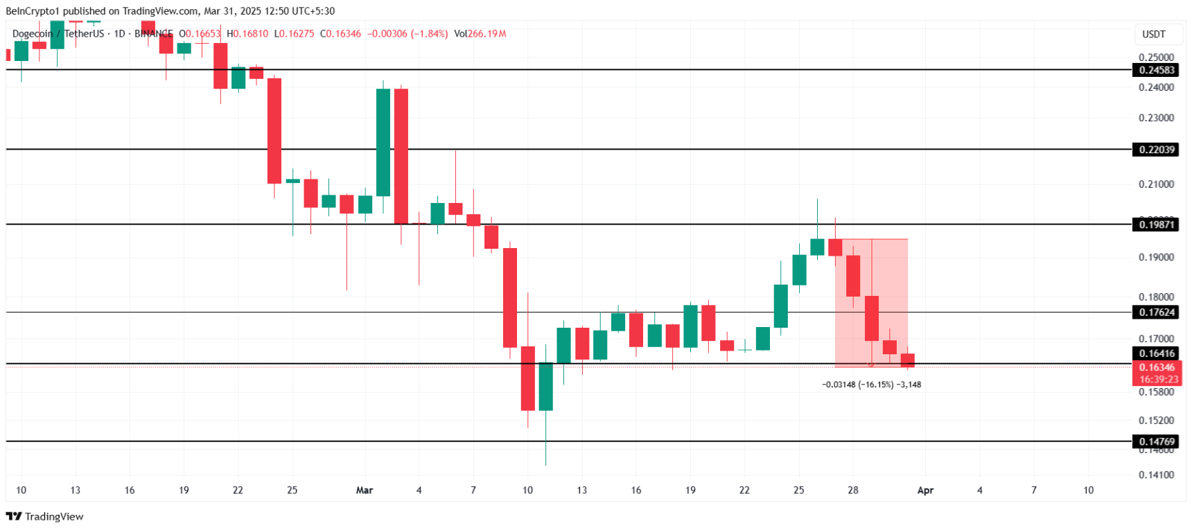 В настоящее время Dogecoin торгуется на уровне $0,163, чуть ниже важной зоны поддержки на уровне $0,164. За последние пять дней эта монета упала на 16% после того, как не смогла преодолеть сильное сопротивление на уровне $0,198. Неудача в завоевании ключевых уровней сопротивления показывает, что DOGE может быть не готов к росту без внешнего импульса.
