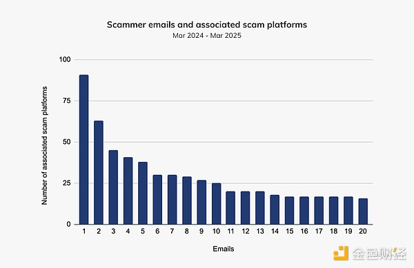 Кроме того, изучив адреса электронной почты, связанные с мошенниками (адреса, которые они использовали для регистрации аккаунтов в финансовых учреждениях), мы обнаружили, что один адрес электронной почты связан с 91 различными мошенничествами. Использование мошенниками нескольких платежных платформ является очень распространенным – это также связано с тем, что такое поведение снижает вероятность того, что следователи смогут выявить повторяющиеся шаблоны.