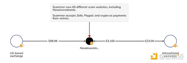 В прошлом большинство мошенников сосредотачивались на реализации масштабных, тщательно организованных схем Понци, что также было распространено в ранних случаях крипто-мошенничества. Но сегодня стало легче массово запускать мошеннические веб-сайты и связывать их с различными платежными платформами. В одном из примеров мы обнаружили крипто-адрес с историей взаимодействия с традиционными платежными сервисами, который был связан с 65 уникальными мошенническими веб-сайтами. Как показано на графике Chainalysis Reactor ниже, этот мошенник получил около 89 000 долларов от централизованной биржи в США.