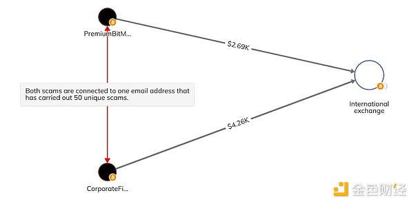 Кроме того, анализ на блокчейне также выявил другой пример, а именно два адреса мошенничества, контролируемые одним и тем же оператором, которые связаны с электронной почтой, имеющей историю работы 50 уникальных мошеннических сайтов.
