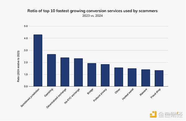 В криптовалютной экосистеме мошенники увеличивают количество используемых ими выходов, используя разрозненность, чтобы одновременно снизить шансы быть пойманными и усилить свои операции. На графике ниже показан топ-10 самых быстрорастущих сервисов конвертации, используемых адресами, связанными с мошенниками, и мы видим рост популярности в санкционных юрисдикциях, игорных сервисах, децентрализованных биржах и биржах без KYC из года в год; Это неудивительно, так как большинство из них относятся к категории высокого риска или нелегальных.