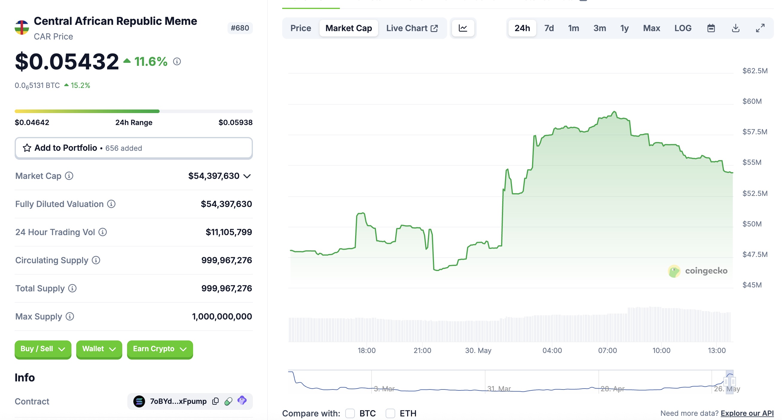 Мем токен страны $CAR Центральноафриканской Республики вырос до небес перед тем, как президент Фостин-Аржанж Туадера объявил о токенизации более 1 700 га земли через блокчейн Solana с июня. Граждане могут получить доступ к праву на землю онлайн с помощью $CAR.