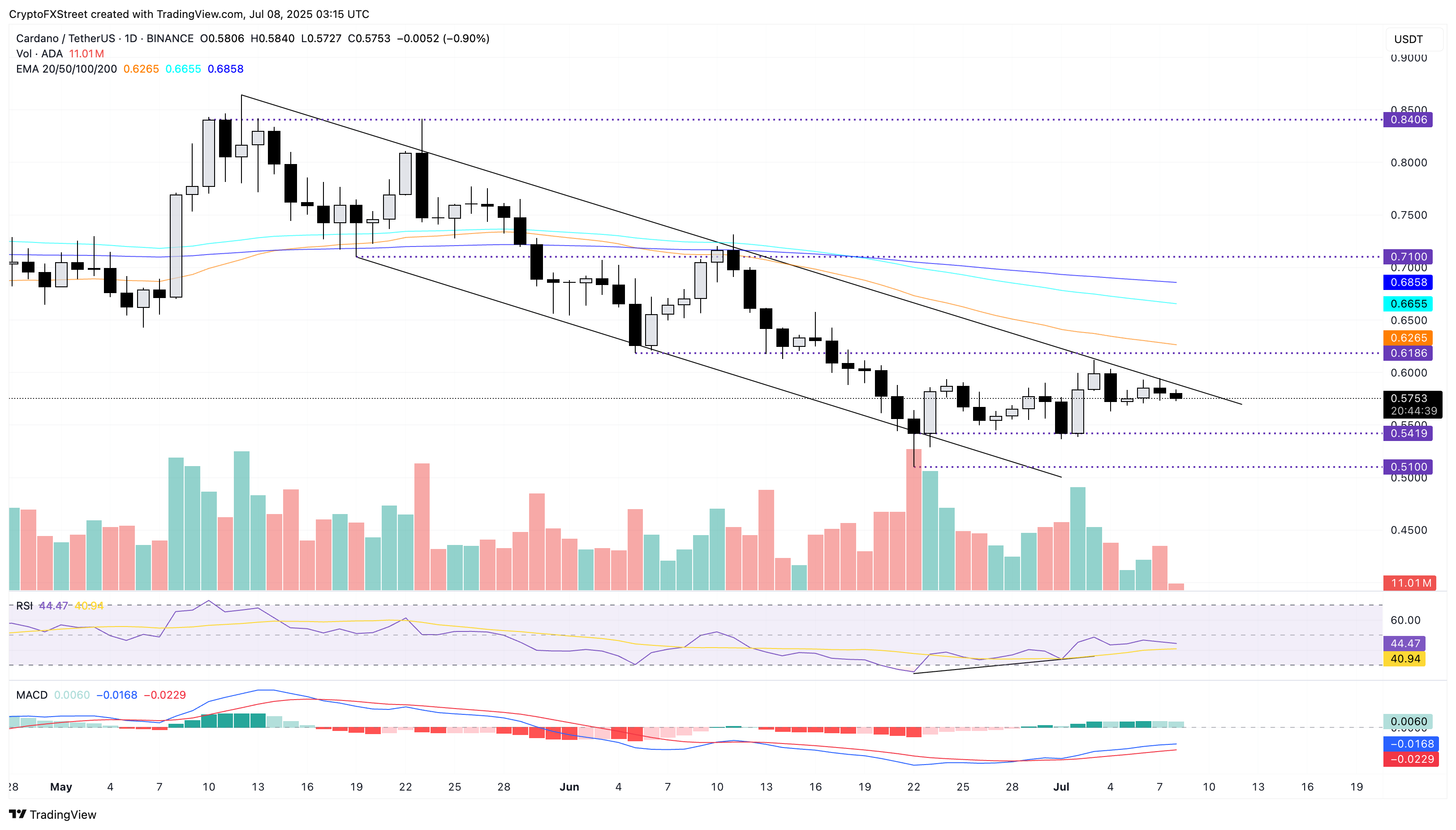 Чтобы укрепить восходящий тренд, ADA должен decisively закрыться выше трендовой линии на уровне 0.5896 долларов. В этом случае целевая цена ADA может составить 0.6186 долларов, и последний тест этого уровня был 18 июня.