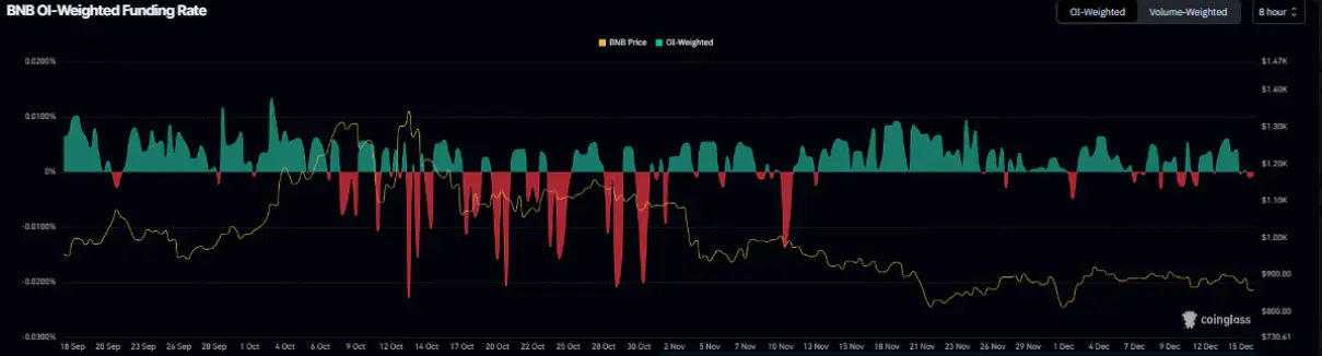 Кроме того, данные о OI-Weighted Funding Rate от Coinglass показывают, что число трейдеров, ставящих на снижение стоимости BNB, превышает число тех, кто ожидает роста. Этот индекс перешел в отрицательную область с понедельника и зафиксировал уровень -0,006% во вторник, что свидетельствует о том, что позиции коротких продавцов (Short) вынуждены платить за позиции длинных (Long). В прошлом, когда ставка финансирования опускалась в отрицательную зону, цена BNB часто переживала сильные коррекции, увеличивая риск глубокого снижения в текущий период.