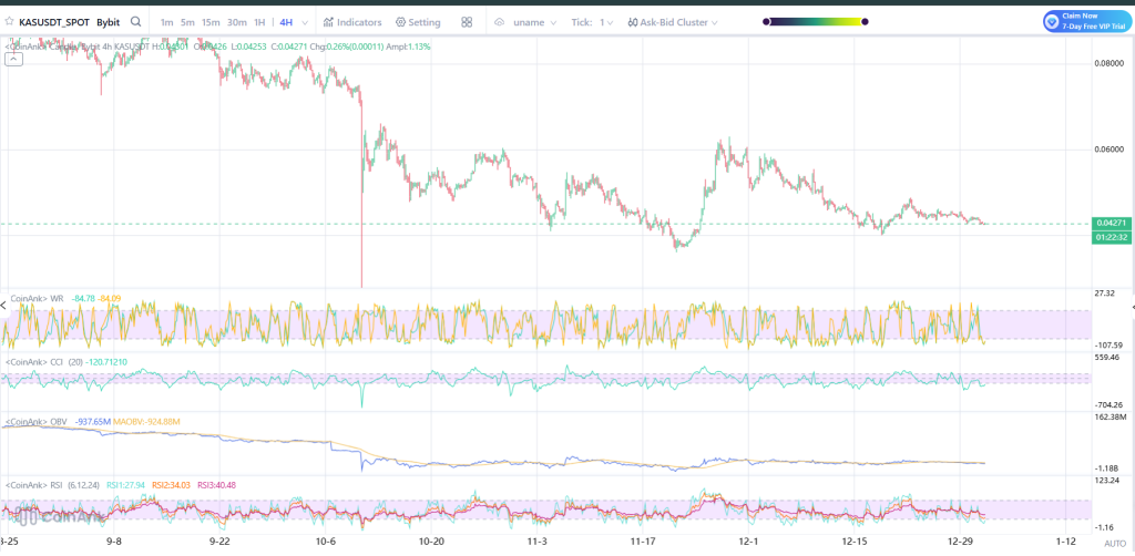 Тем не менее, цена Kaspa все еще ощущает тяжесть своего более широкого нисходящего тренда. За последние 90 дней цена снизилась примерно на 46%, а декабрь в основном прошел как консолидация выше $0.04.