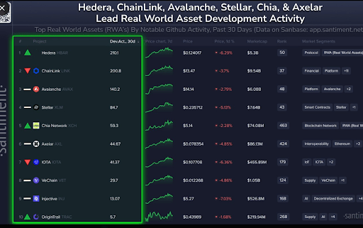 Hedera, Chainlink, Avalanche и Stellar возглавили разработку криптовалютных активов реального мира за последние 30 дней, согласно рейтингу активности на GitHub, опубликованному Santiment в среду. Обновление, опубликованное аккаунтом Santiment SanSights, отслеживает подтвержденные действия по разработке в репозиториях проектов и сравнивает месячные изменения с помощью направленных индикаторов.