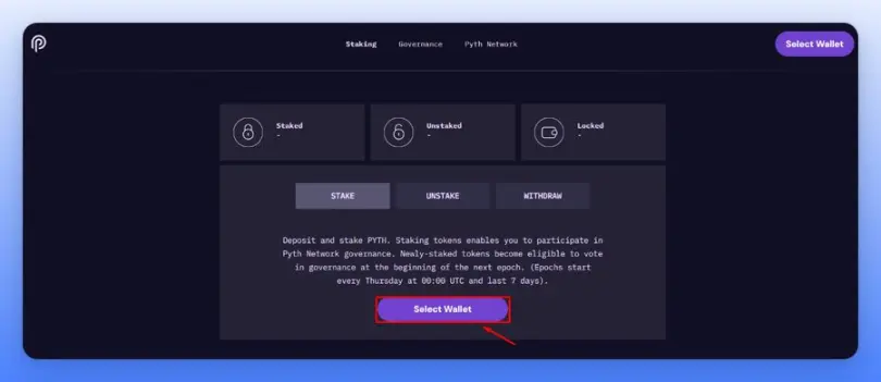 Размещение ваших токенов позволяет вам участвовать в управлении сетью Pyth. Новые токены имеют право на голосование по управлению в начале следующей эпохи. (Эпохи начинаются каждый четверг в 00:00 UTC и длятся 7 дней).