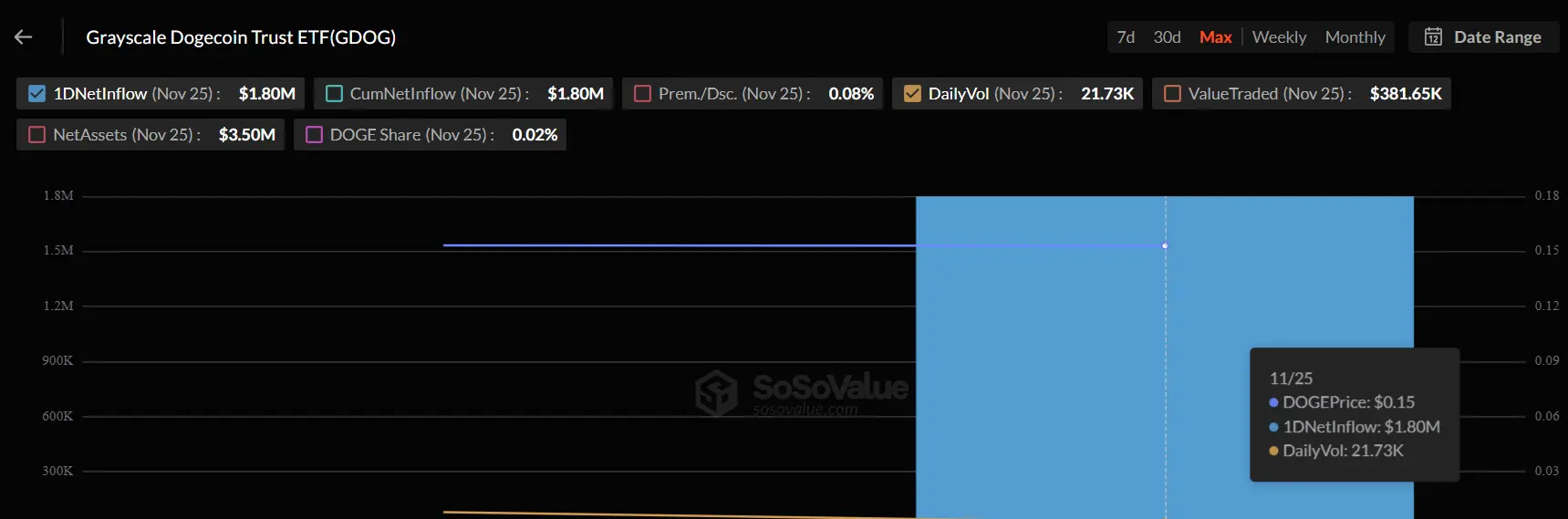 Данные ETF показывают, что Dogecoin ETF Grayscale (GDOG) неожиданно плохо дебютировал. В день запуска GDOG зафиксировал нулевые притоки — необычный результат для высоко ожидаемого спотового продукта. К вторнику общий объем притоков составил всего 1,8 миллиона долларов.