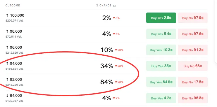 Маркетмейкеры заявили, что Биткойн вновь поднялся выше 90 000 долларов, и скорее это связано не с самим криптоиндустрией, а с пересмотром риска в традиционном бизнесе в конце года. Отток средств из ETF по-прежнему является препятствием, согласно данным, трейдеры считают, что вероятность того, что Биткойн достигнет пика на этой неделе ограничена примерно 92 000 долларов, составляет 84%, как показано на рисунке ниже: