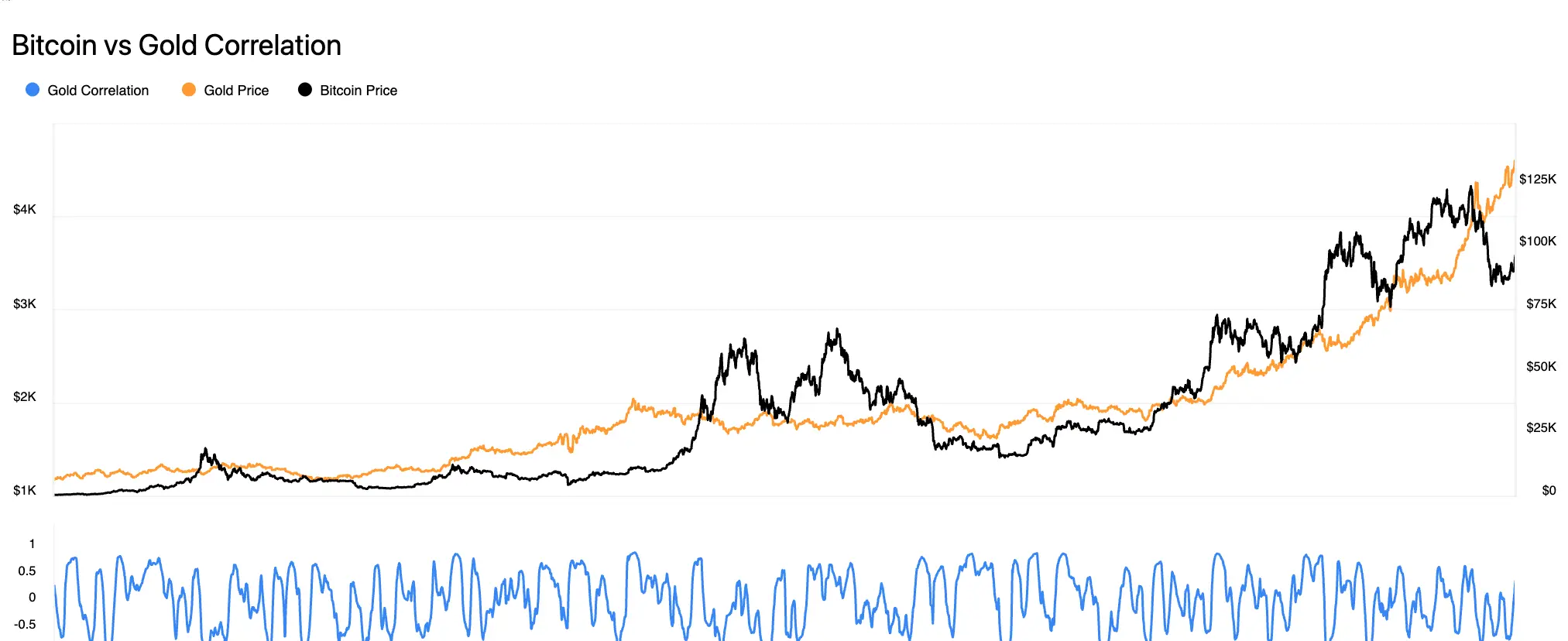 В 2020 году связь стала еще более выраженной: реальные доходности рухнули, и ликвидность хлынула в систему, а рост Bitcoin ускорился значительно позже, чем золото уже перестроилось.