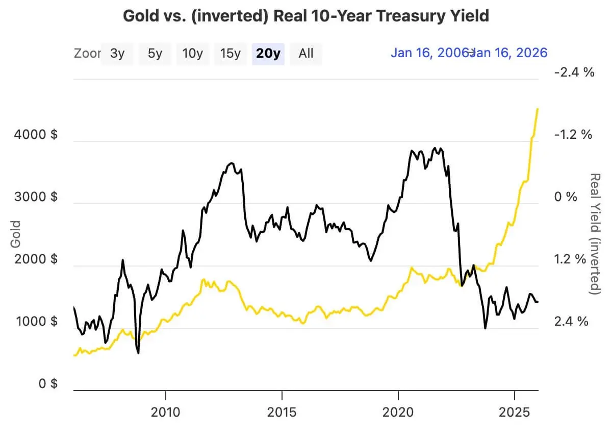 Данные по казначейским облигациям США показывают, что цены на золото тесно связаны с реальными доходностями: рост обычно начинается после того, как реальные доходности начинают снижаться, а не после снижения ставок. Мягкая риторика почти никогда не могла изменить эту зависимость, как только реальная доходность по казначейским облигациям начала сжиматься.
