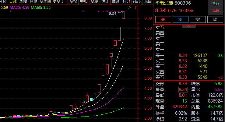 Huadian LiaoNeng (600396) достиг лимита и продолжает серию из 8 дней роста, за 8 дней суммарный рост превысил 110%.