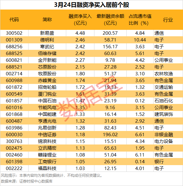 Что касается отдельных акций, 24 марта 1670 акций получили чистый приток финансирования, из них 361 — с притоком более 10 млн юаней, а 21 акция — с притоком более 100 млн юаней. Лидером по притоку является Xin Yisheng с чистым притоком 448 млн юаней; далее идут Demingli и Cambrian, с притоком 246 и 242 млн юаней соответственно; также в числе лидеров — Bawei Storage, Jinkai New Energy, Xinyuan Shares и другие.