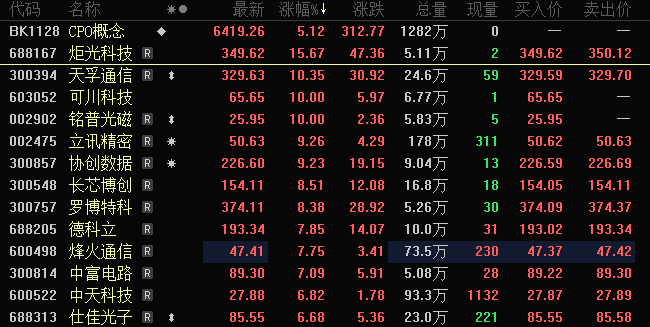 Концепция CPO лидирует по росту, Alyard “20cm” достигла лимита, а Mingpu OptoMagnet, Kechuan Technology и другие достигли лимита.